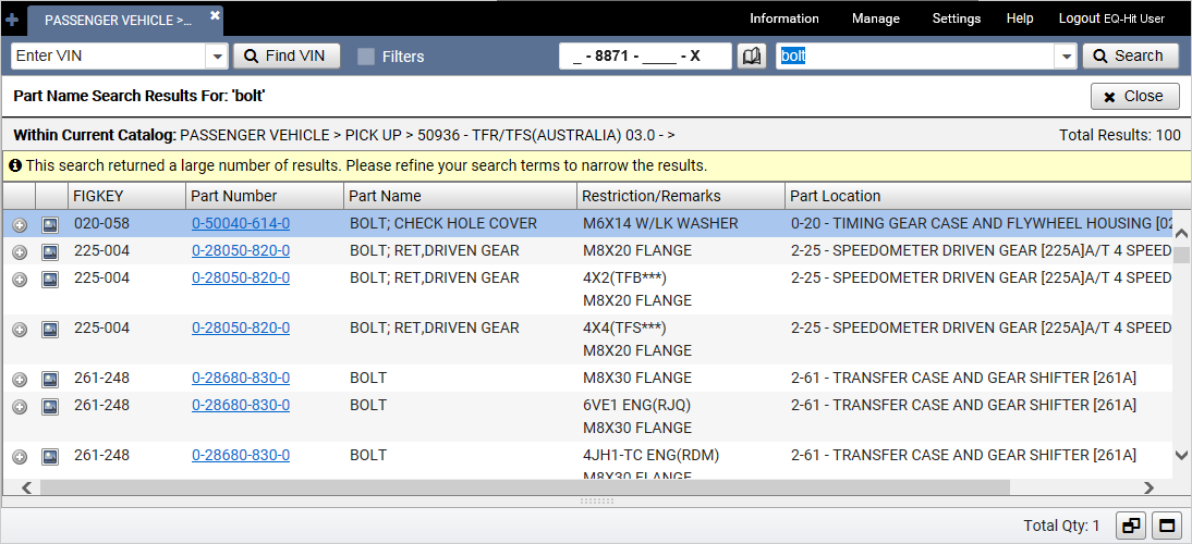 Once you have selected a product, you can search for a part by FIG, FIGKEY, part name or number. If you have not yet navigated to a catalog, you can search for parts by full part number only.